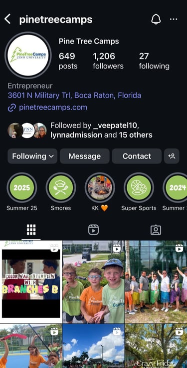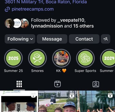 These are the four accounts I manage — each with a distinct purpose, audience, and content strategy. From institutionally branded content for Lynn University Admissions and Pine Tree Camps, to curated lifestyle posts on my personal Instagram, to educational and relatable videos on TikTok, every feed reflects a different side of how I create, connect, and communicate online.