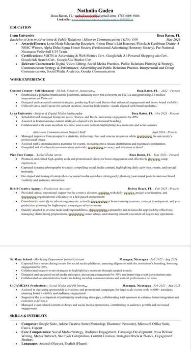 I’m Nathalia Gadea, a Nicaraguan-born Advertising and Public Relations major at Lynn University with a passion for storytelling that blends creativity, cultural insight, and strategic thinking. As a five-time Dean's List honoree and NSAC top 8 finalist , I bring academic excellence and hands-on communications experience into every project, from social media strategy to campaign development and brand writing.
